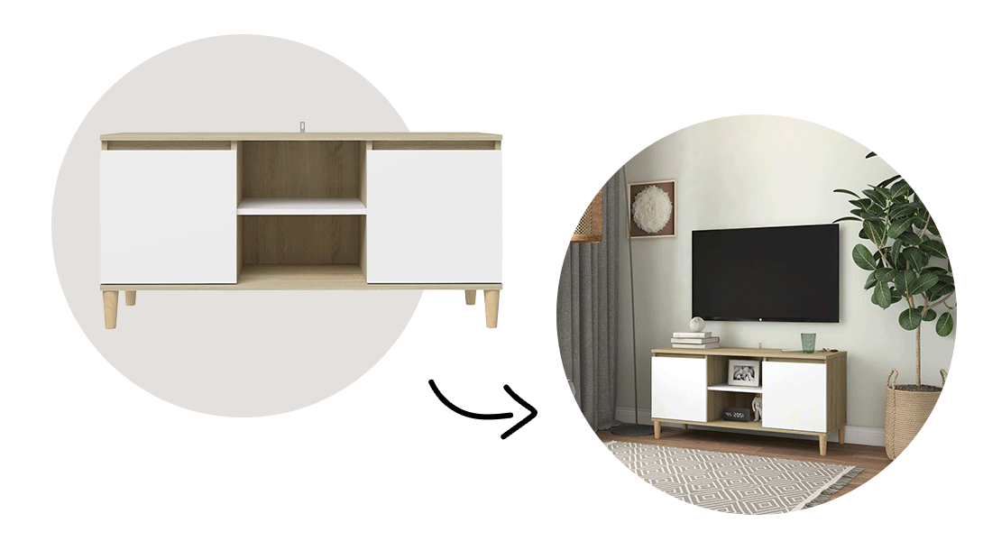 Pro navození pocitu klidu zvolte čisté linie, nepřeplněné prostory a neutrální barevnou paletu. Například TV skříňka, která kombinuje strukturu přírodního dřeva s bílými dvířky. Své věci ukládejte za dvířka, abyste jednoduchost interiéru nenarušili nepořádkem, ale několik předmětů nechte na otevřených policích, abyste do bydlení vnesli trochu barvy.